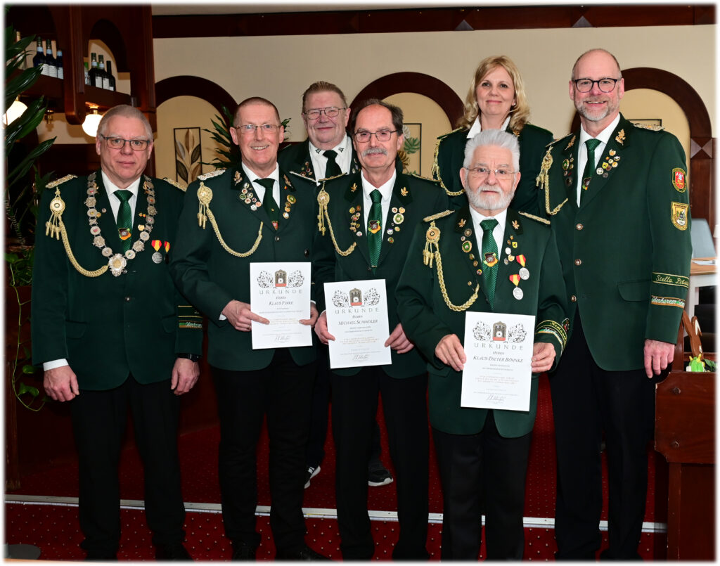 Nun sollte der Punkt Ehrungen einen größeren Rahmen einnehmen. Zur Überraschung der Beteiligten, ehrte der Präsident Hartmut Wawrzinek, Alexandra Stein für 25 Jahre Kreisschriftführerin im OHS mit einem Blumenstrauß, die Goldenen Verdienstadel des Deutschen Schützenbundes, für ihre unermüdlichen Einsatz um das Deutsche Schützenwesen ging an Klaus-Dieter Böhnke, Michael Schindler und Klaus Finke. Rudolf Morbitzer erhielt die Verdienstadel in Bronze.